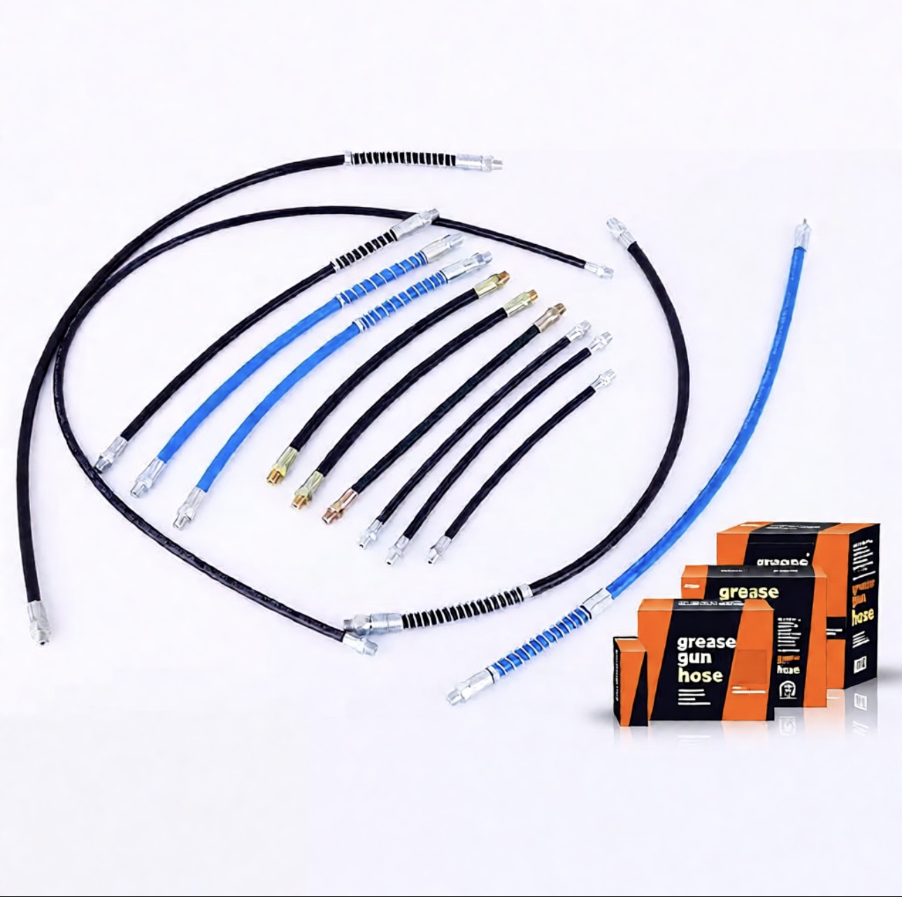 Our heavy duty grease gun hoses are professionally engineered for high-pressure industrial lubrication tasks, adopted premium oil-resistant rubber inner tube and high-tensile steel wire reinforcement structure, matched with corrosion-resistant 1/8″ NPT male & female precision fittings, to ensure leak-free stable performance under 10000PSI working pressure and 40000PSI burst pressure. Available in 6/12/18/24/36/48/60/72 inch multiple lengths, support kit and bulk pack customization, fully meet different maintenance needs.