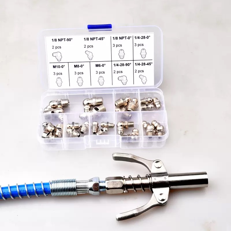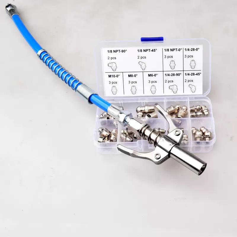 grease gun kit with extension hose, 25pc grease fitting assortment, heavy duty grease gun coupler, SAE metric NPT grease nozzle kit, automotive lubrication tool set, 30cm grease hose kit, industrial grease fitting kit, tractor grease gun accessories, multi-angle grease adapter set, grease fitting replacement kit