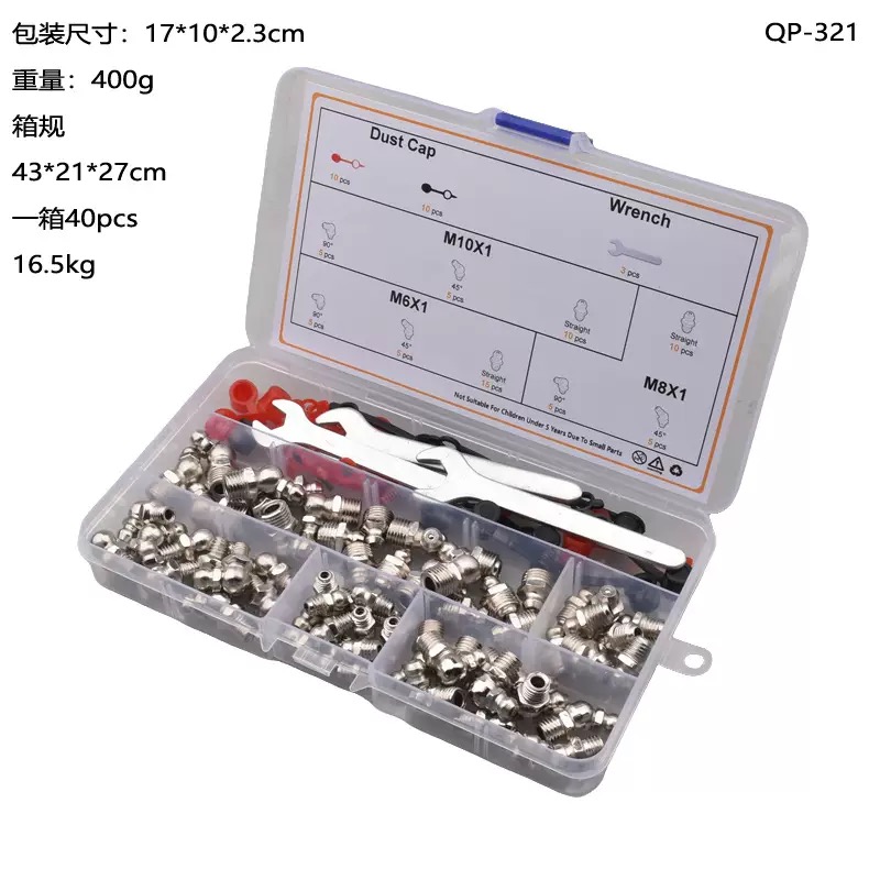 metric grease fitting assortment kit, M6 M8 M10 grease nipples, grease fitting set, grease fitting kit with wrench, grease nipple dust caps, zinc plated grease nipples, straight and angled grease fittings, automotive grease fitting kit, industrial lubrication tools, farm equipment grease nipples, universal metric grease fittings, heavy duty grease nipple set, grease fitting storage case, affordable grease fitting kit, new metric grease nipple assortment