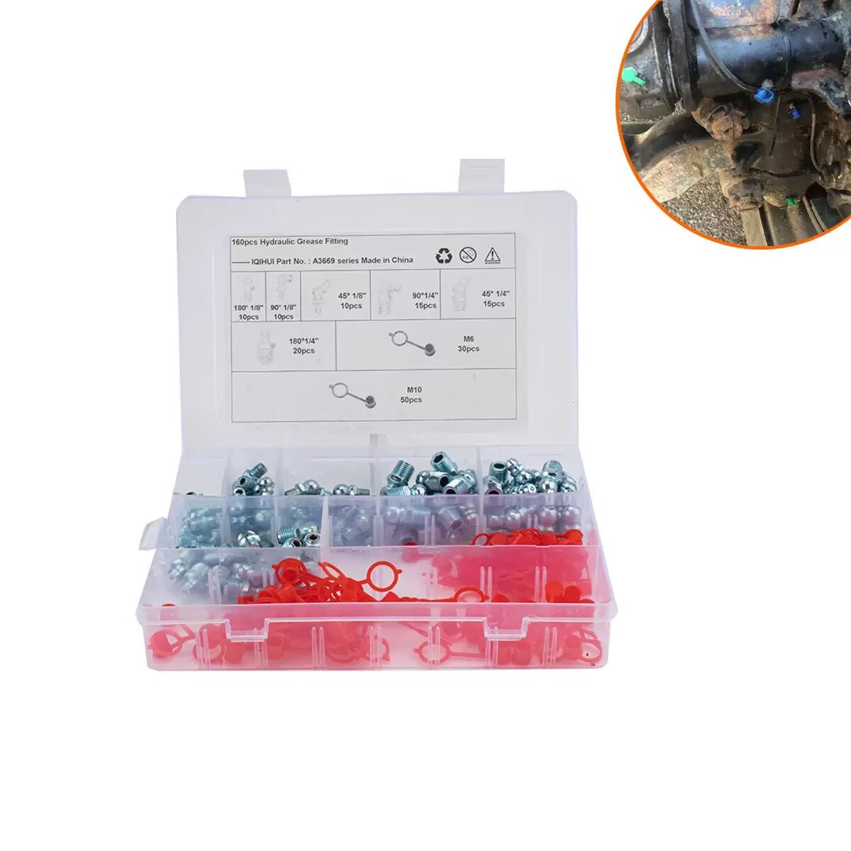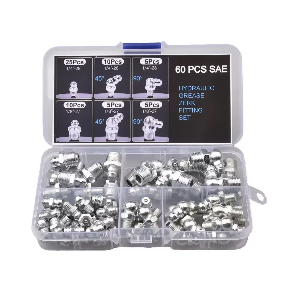 Assorted iron grease fittings kit with 10-50 pieces (quantity varies by kit option), includes multi-angle and multi-thread sizes to meet different lubrication needs.
