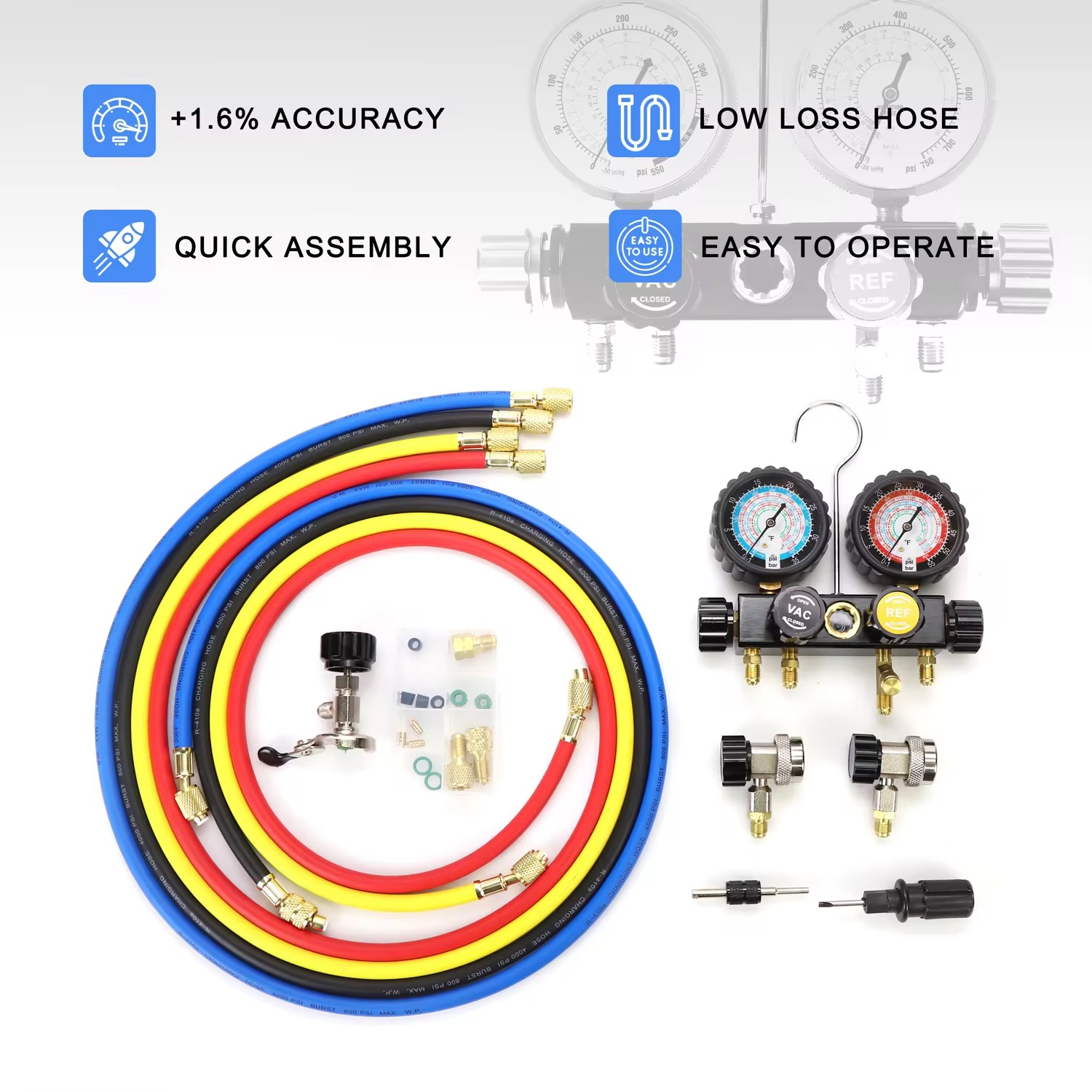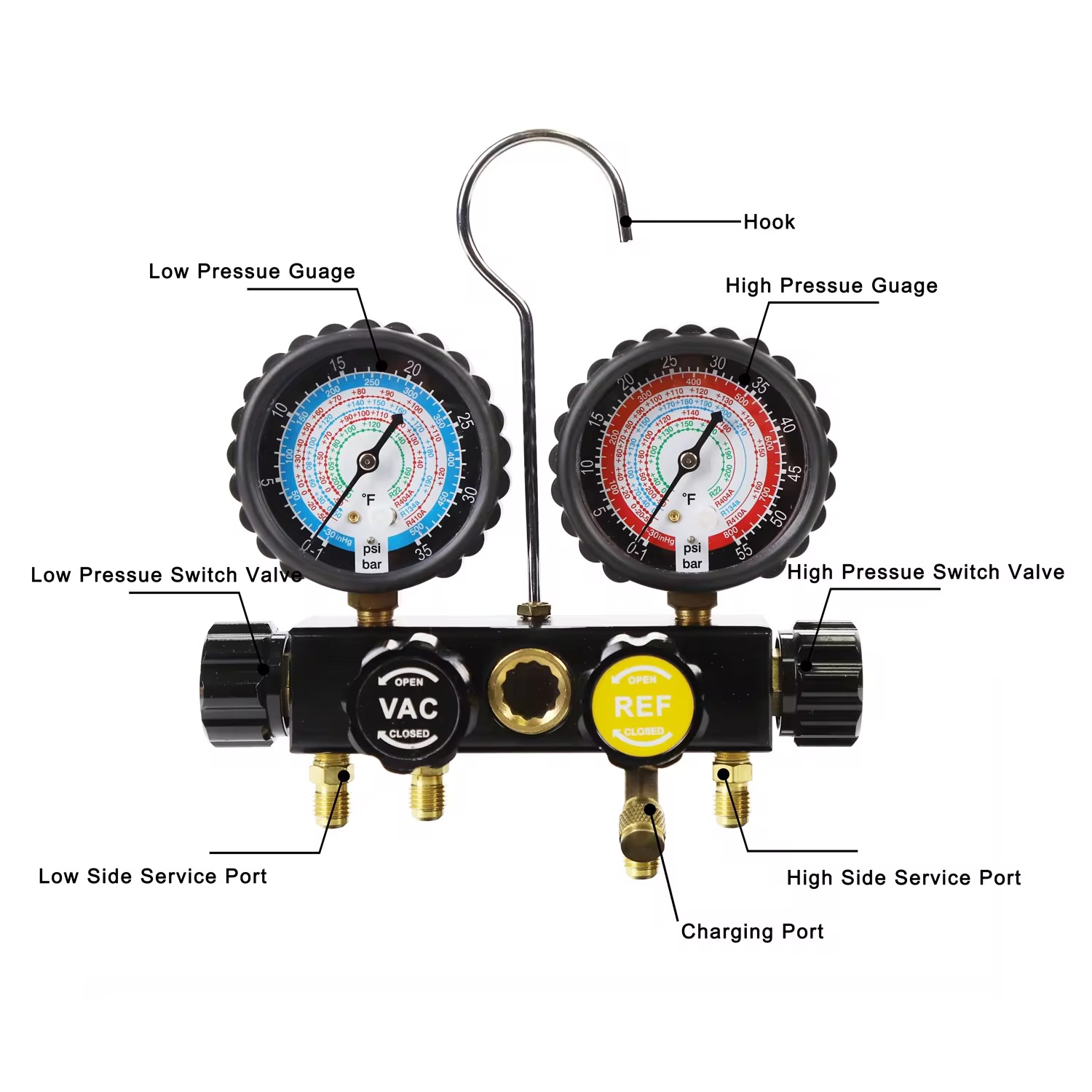 Local Keywords (Español/العربية): juego de manómetros de aire acondicionado, herramientas de reparación de aire acondicionado de auto, مقاييس ضغط مكيف السيارة, أدوات إصلاح مكيف السيارة | English Keywords: AC gauge set for South America, Middle East car AC repair tool, high temperature resistant AC tool, hot area freon recharge kit
